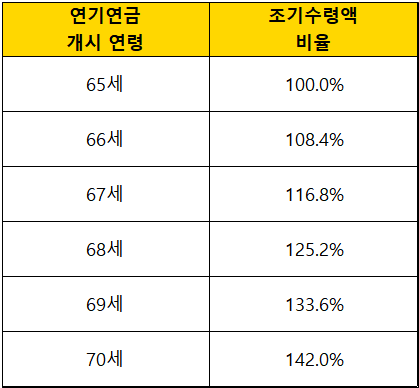 반대로 노령연금 수령시기를 1년씩 연기할 때마다 연금액은 8.4%씩 증가하게 됩니다. 수령시기를 1년 늦추게 되면 8.4%가 증가하고, 5년을 늦추면 142%를 받을 수 있게 됩니다. 65세에 100만원을 받을 예정인 사람이 5년을 연기하여 70살부터 연금을 수령한다면 142만원을 받게 됩니다.