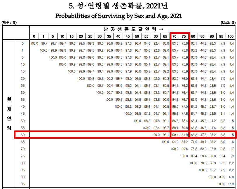 그렇다면 여기에서 중요한 점은 현재 60세인 내가 72세보다 더 살 수 있는가를 따져봐야 합니다. 아래는 통계청에서 발표한 2021년 생명표의 내용입니다.