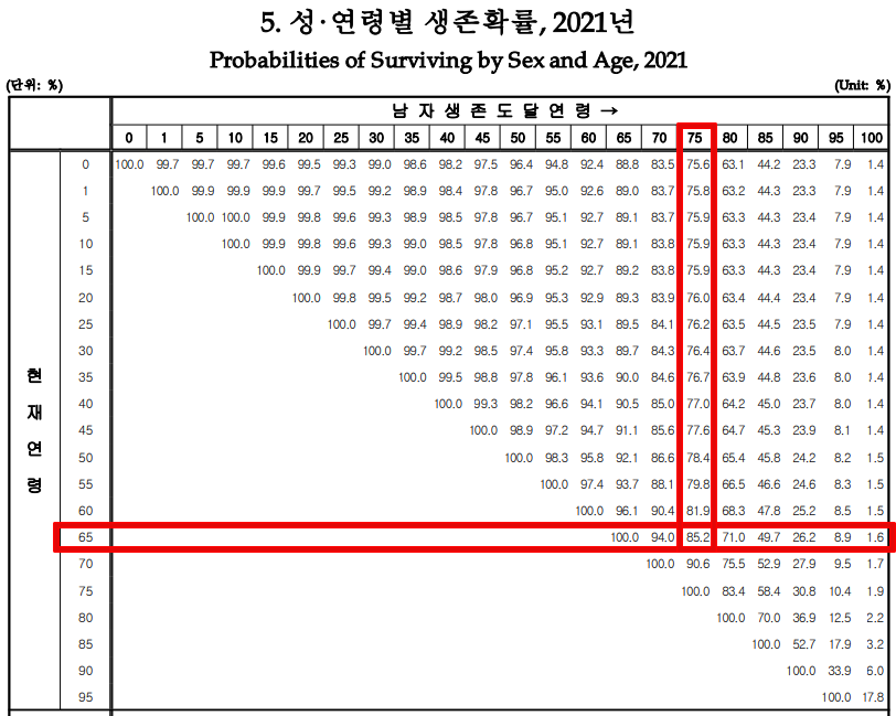 그렇다면 여기에서 중요한 점은 현재 65세인 내가 76세보다 더 살 수 있는가를 따져봐야 합니다. 아래는 통계청에서 발표한 2021년 생명표의 내용입니다.