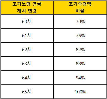노령연금 수령시기를 1년씩 앞당길 때마다 연금액이 6%씩 감소하게 됩니다. 수령시기를 1년 앞당기게 되면 6%가 차감되어 원래 금액의 94%를 받을 수 있고, 2년을 앞당기게 되면 88%, 3년을 당기면 82%, 4년을 당기면 76%, 5년을 앞당기면 원래 받아야 할 금액의 70%를 받게 되는 것입니다.