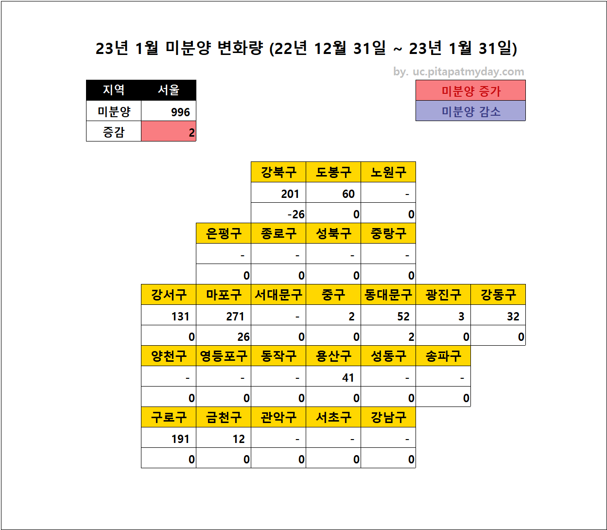 아래 그림은 22년 12월말 대비 23년 1월말 기준으로 서울의 미분양 현황의 변화를 나타낸 그림입니다. 서울의 미분양 수량은 지난달대비 2세대 증가한 996세대입니다. 12월에는 전달대비 129세대 증가를 하였는데, 1월에는 미분양 세대 증가폭이 줄어들었습니다.