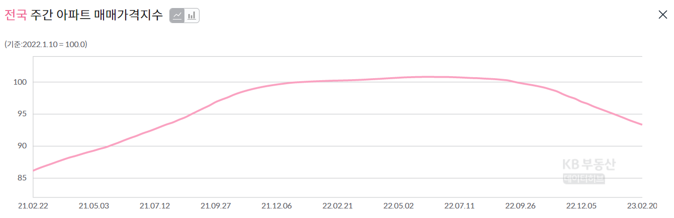아래는 KB 부동산에서 제공하는 전국 아파트 매매가격지수입니다. 23년 2월말까지 전국의 아파트 가격은 지속적으로 하락세를 유지하고 있습니다.