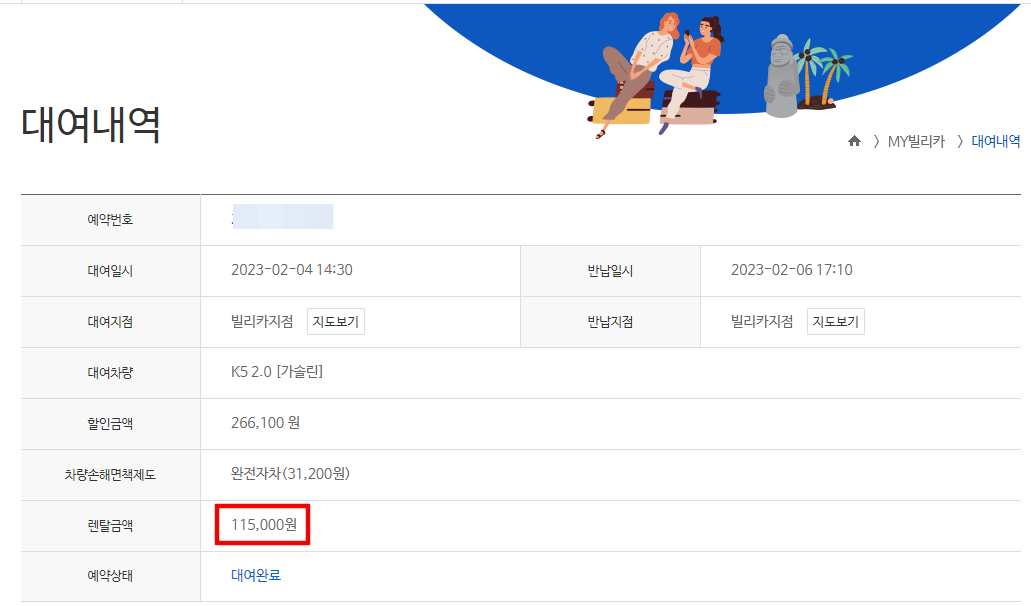 아래는 제가 실제로 K5를 완전자차로 2박 3일간 빌렸을 때의 비용입니다. 완전자차 비용 31,200원을 제외하면 차량 대여비용은 80,000원 정도가 들었네요. 당시에는 일정에 촉박하게 예약을 했더니 비용이 다소 상승했었네요.