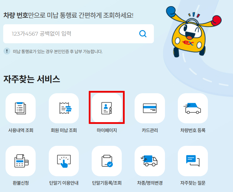 고속도로 통행료 홈페이지 회원인 경우 다른 방법으로 미납 통행료를 조회하실 수 있습니다. 홈페이지 화면에서 마이페이지를 클릭합니다.