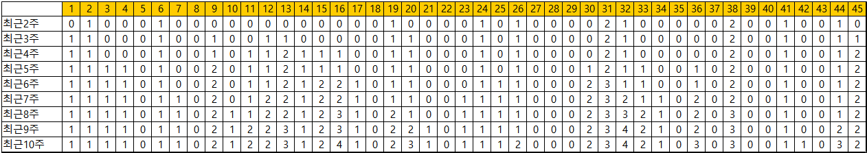 아래는 다른 관점에서 최근 해당 번호가 나온 숫자를 보여주는 표입니다. 최근 당첨된 숫자를 고려하여 숫자를 조합하는데 활용하시기 바랍니다.