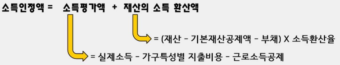중요한 점은 소득인정액을 계산하는 방법을 정확히 알고 계셔야 합니다. 흔히 알고 계시는 월급이나 기타 소득과 같이 통장에 들어오는 금액이 아니라 소득인정액이라는 개념입니다. 소득인정액이란 실제소득과 재산을 소득으로 환산하는 금액으로 이루어집니다. 이 때 실제소득에서는 근로소득공제 및 가구원수별 지출비용이 공제되기 때문에, 실제 소득보다 낮은 금액으로 계산이 될 수 있습니다.