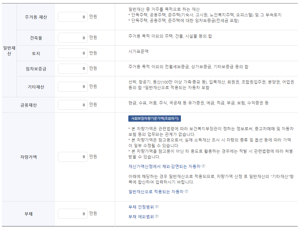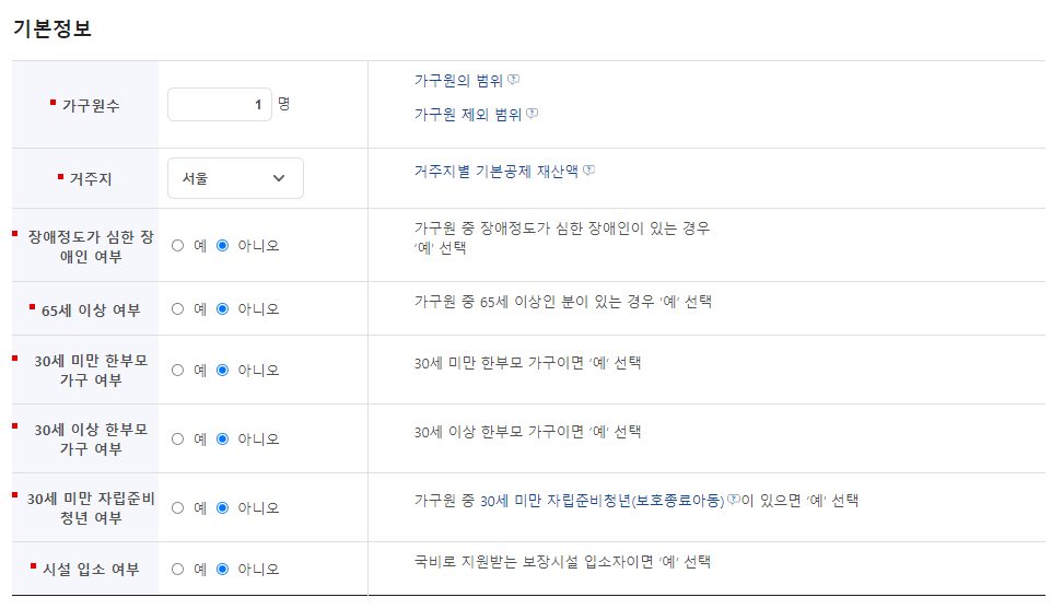 나에 대한 기본정보를 입력하면 소득인정액을 계산해주고 이에 따라 받을 수 있는 국민기초 생활보장 혜택을 나열해주기도 합니다. 여기서 입력하셔야 하는 항목은 아래와 같이 기본정보와 소득 및 재산정보를 입력하셔야 합니다. 각 항목별로 상세설명도 나와있으니 해당 설명을 보시면서 기입하시면 됩니다.