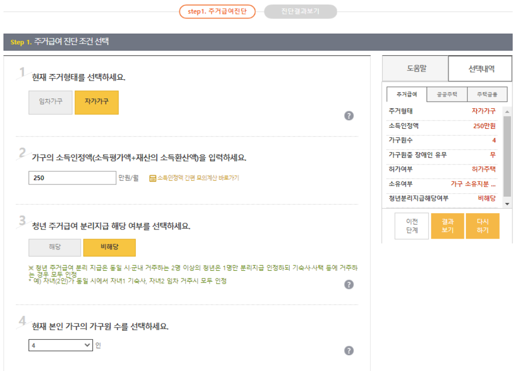 자가진단을 진행하실 때 가장 애매한 부분이 소득인정액에 대한 부분일텐데요. 자가진단에서는 소득인정액을 모의계산할 수 있는 기능도 제공하고 있습니다.